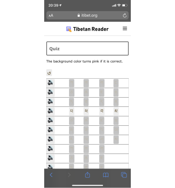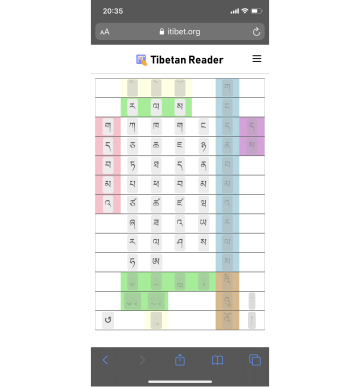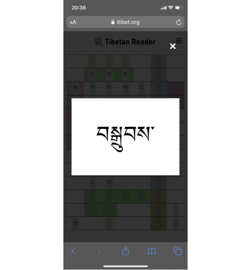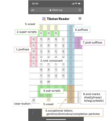 The "Tibetan Reader" web page enables users to listen to Tibetan syllabic pronunciation that changes with different combinations of letters (such as prefixes, superscripts, root consonants, subscripts, vowels, suffixes). When you tap in sequence, you can listen to the spoken spelling of the letters that make up the Tibetan syllable and the final pronunciation of that syllable.