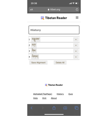 - 「།」(シェー)ボタンをタップした場合は、「་」(ツェク)ボタンをタップした場合に比べて、Historyページでの音節間の間が長くなります。